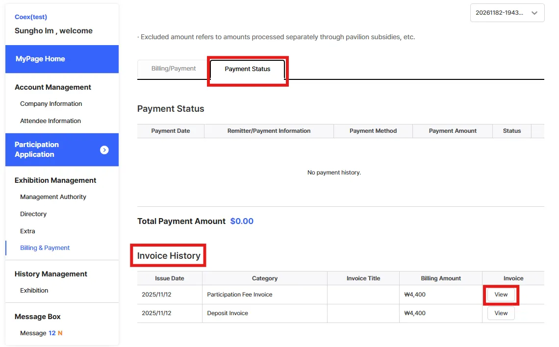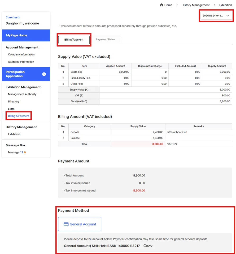 Go to [My Page] > [Exhibition Management] > [Billing & Payment]