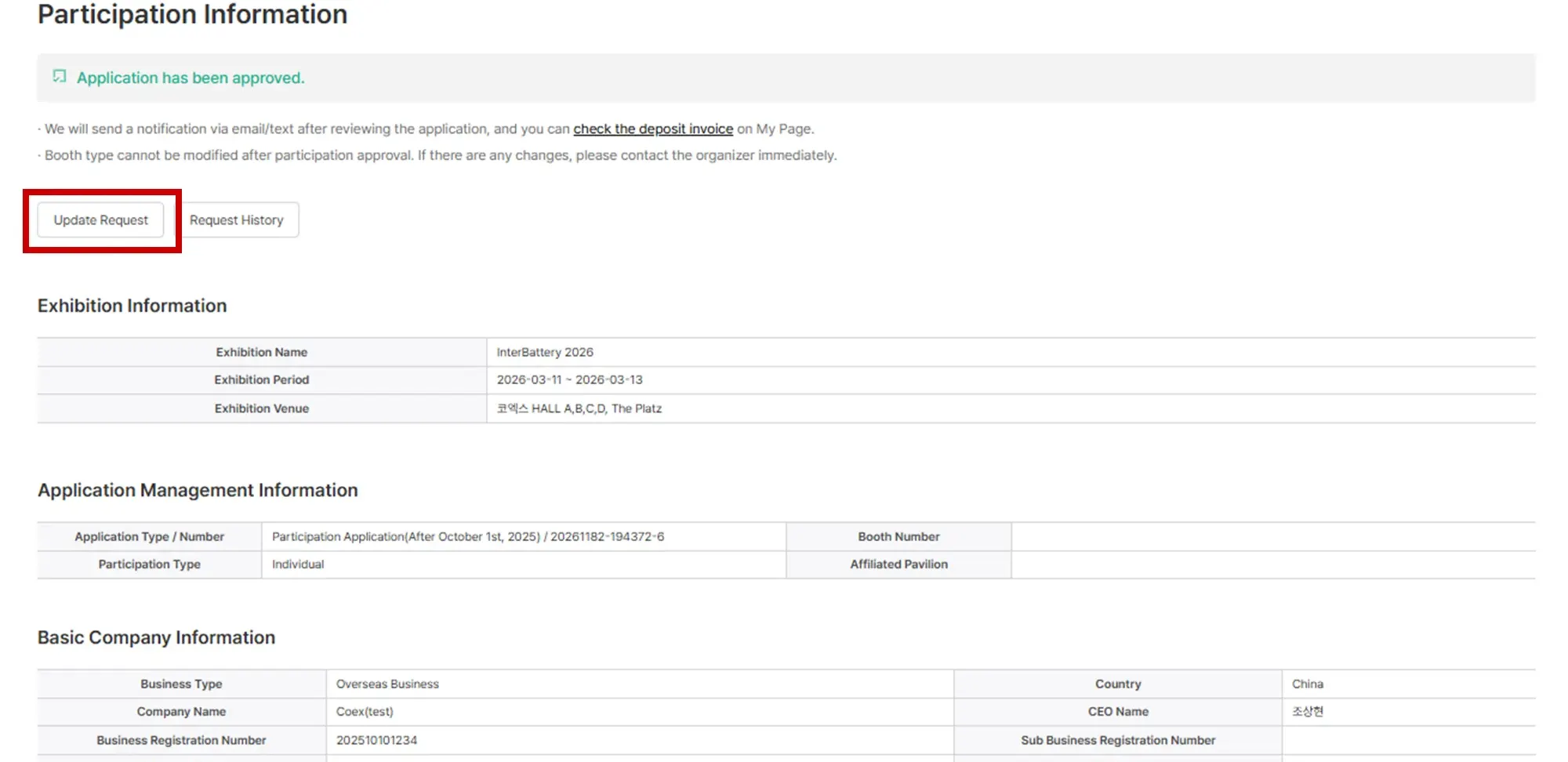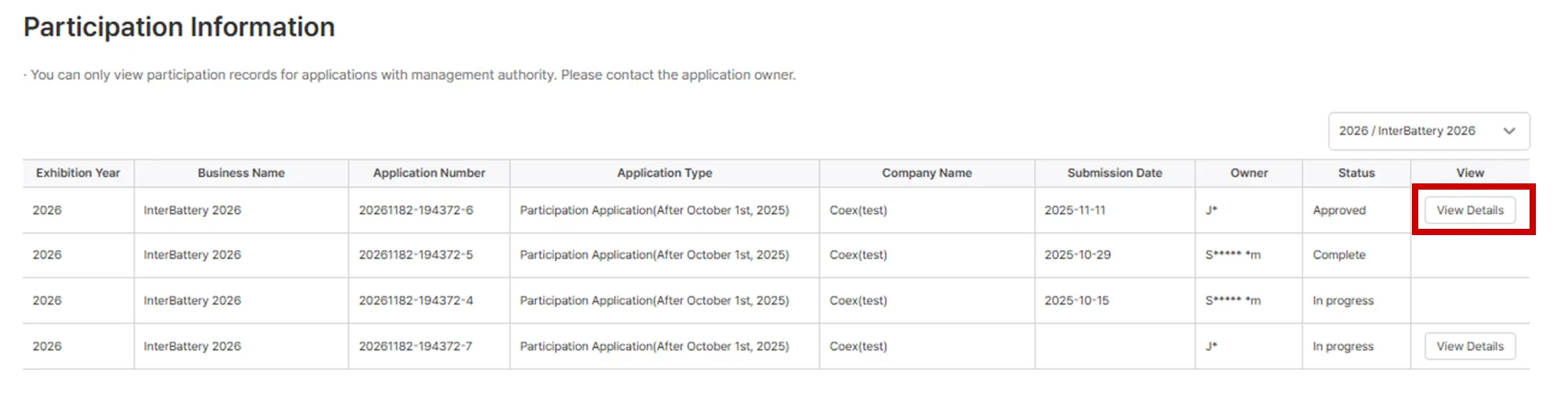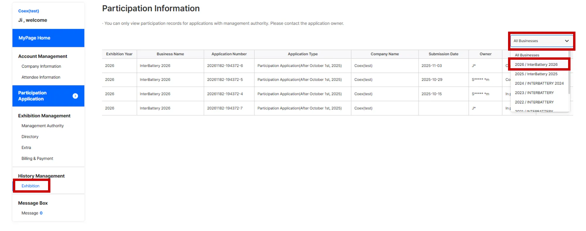 In MyPage, navigate to [History Management] > [Exhibition], and select [2026/ InterBattery 2026]