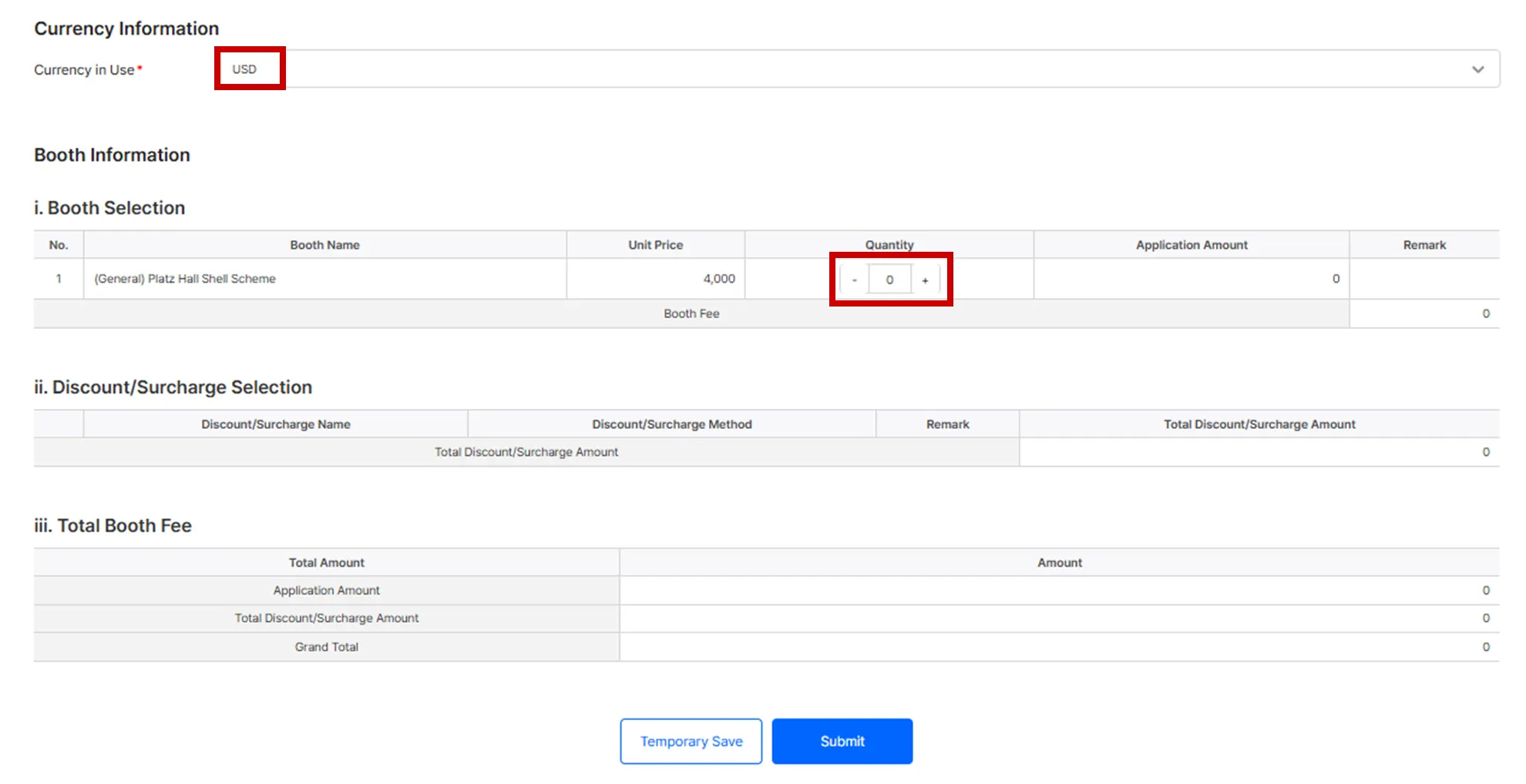 Under [Booth Information], select your desired [Booth], confirm [Discount/Surcharge Selection], and verify the [Total Booth Fee] before submitting.